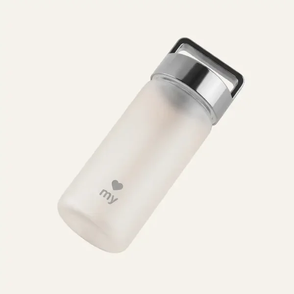 Deze fles heeft een brede opening voor gemakkelijk gebruik en is ideaal voor het toevoegen van je favoriete supplementen, poeders of gearomatiseerde drankjes. De matte glazen afwerking met subtiele maatstreepjes helpt je om de hele dag door bewust gehydrateerd te blijven.